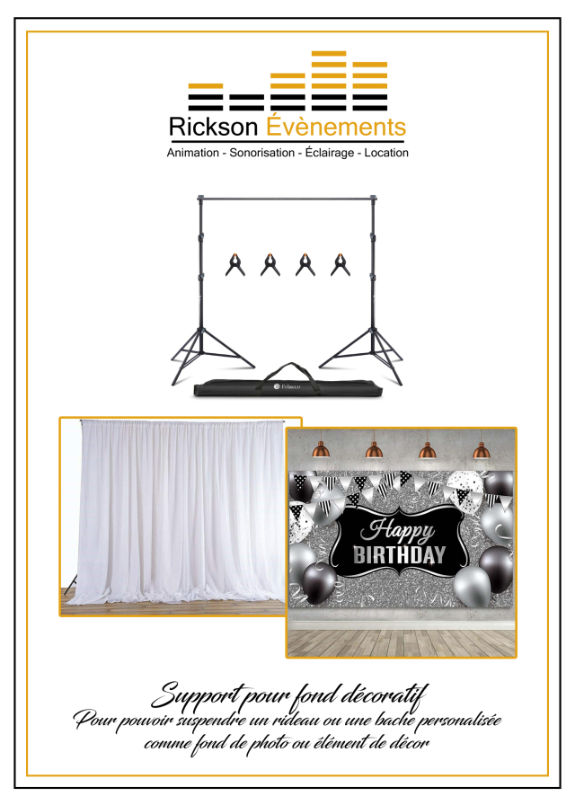 Ce support pour rideau ou bâche pouvant être déplié jusqu'à 3m sur 2m vous permettra de créer un fond esthétique pour vos photos et sera un élément de décor saisissant pour votre évènement.